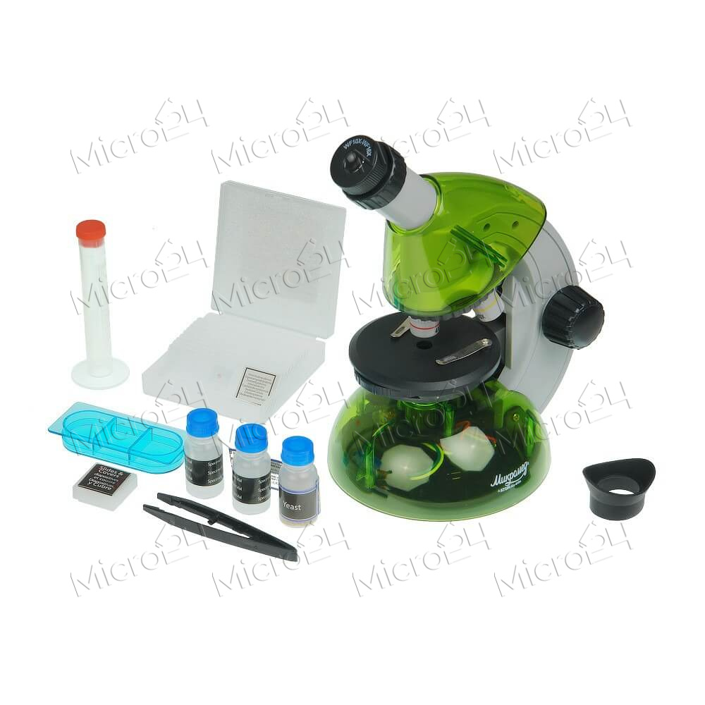 Монокулярный оптический прибор для детей. Используется для изучения прозрачных, непрозрачных, жидких и сыпучих объектов, чешуек и пленок. Предусмотрено три объектива с увеличением 4, 10 и 40 крат. Фокусировка настраивается с помощью специальных маховиков, благодаря чему контрастность изображения не сбивается от неосторожных движений. Есть два режима светодиодной подсветки: сверху и снизу. Предметный столик регулируется по высоте, оснащен зажимами и набором диафрагм. Питается микроскоп от двух батареек АА. В комплектацию входят предметные и покровные стекла, мензурка с мерными делениями, емкость, наклейки, пинцет, пипетка и флакон.